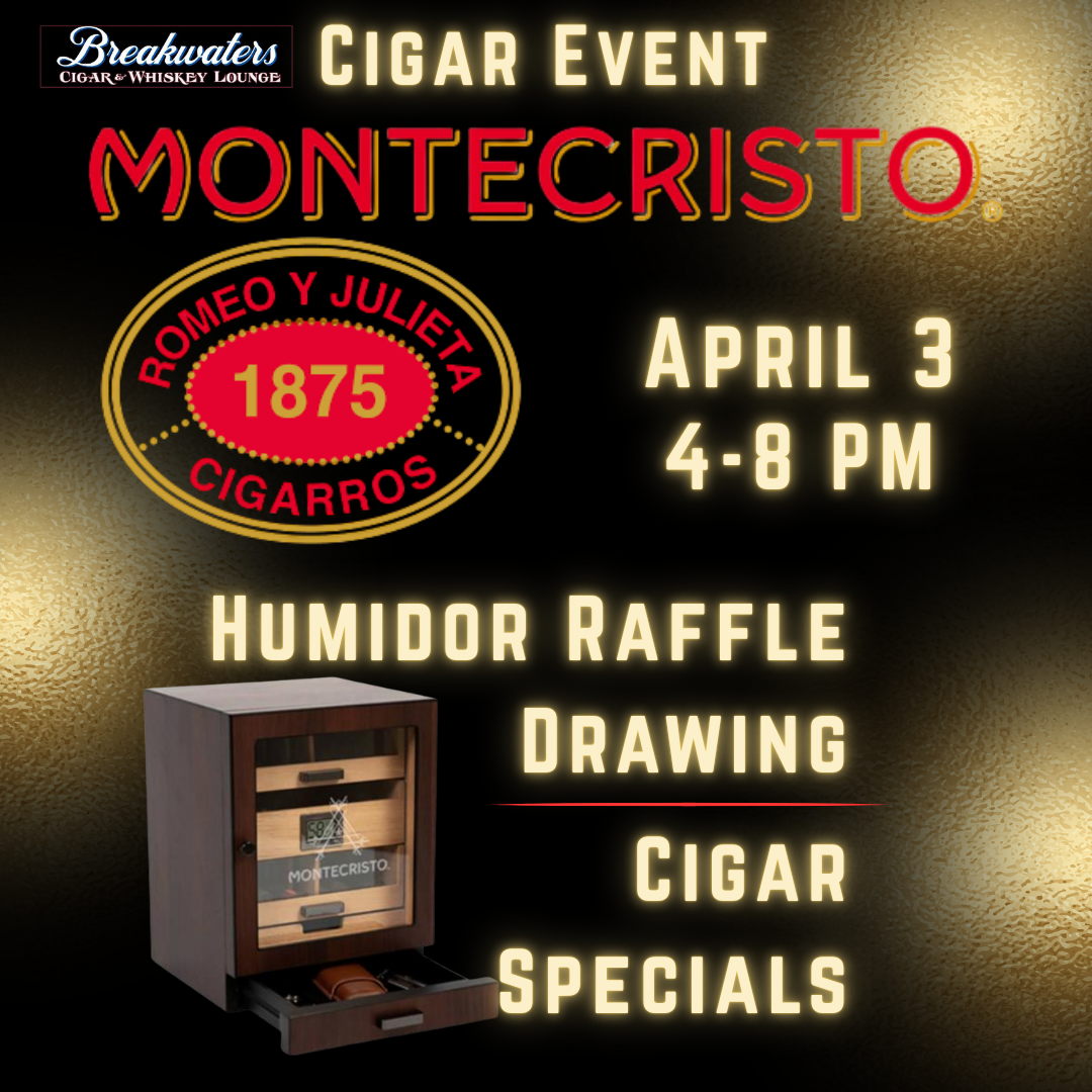 Back to All Events Montecristo & Romeo y Julieta Cigar Event Friday, April 3, 2026 8:00 PM 8:00 PM Breakwaters Cigar & Whiskey 796 Aquidneck Avenue Middletown, RI, 02842 United States (map) Google Calendar ICS