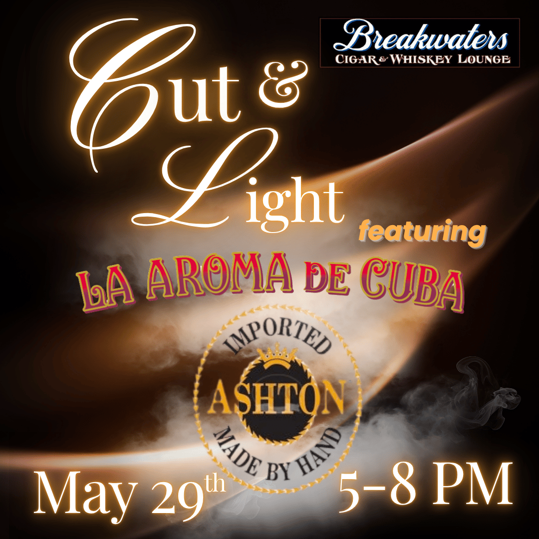 Back to All Events Cut & Light with Ashton Cigars & La Aroma de Cuba Friday, May 29, 2026 5:00 PM 8:00 PM Breakwaters Cigar & Whiskey 796 Aquidneck Avenue Middletown, RI, 02842 United States (map) Google Calendar ICS